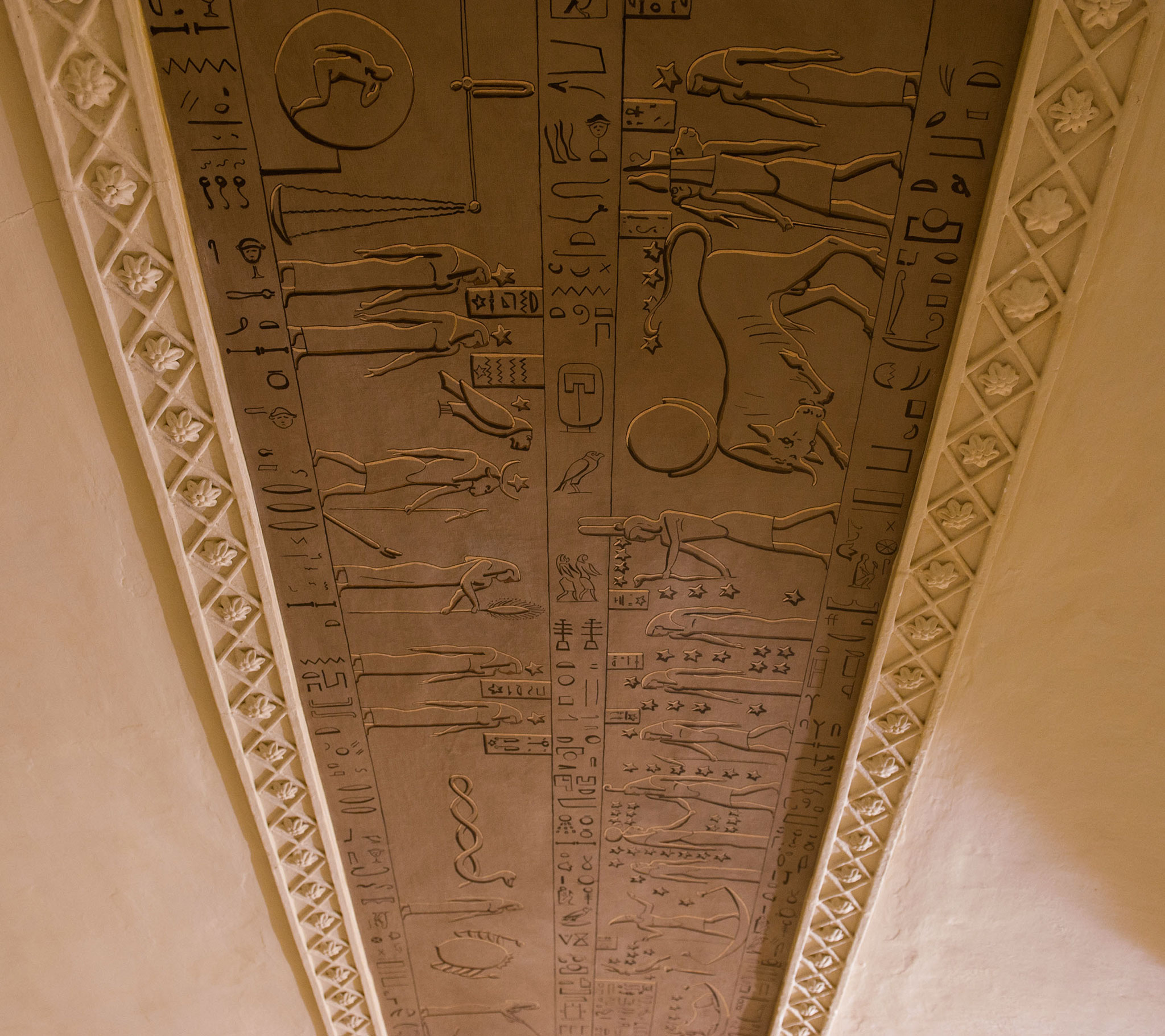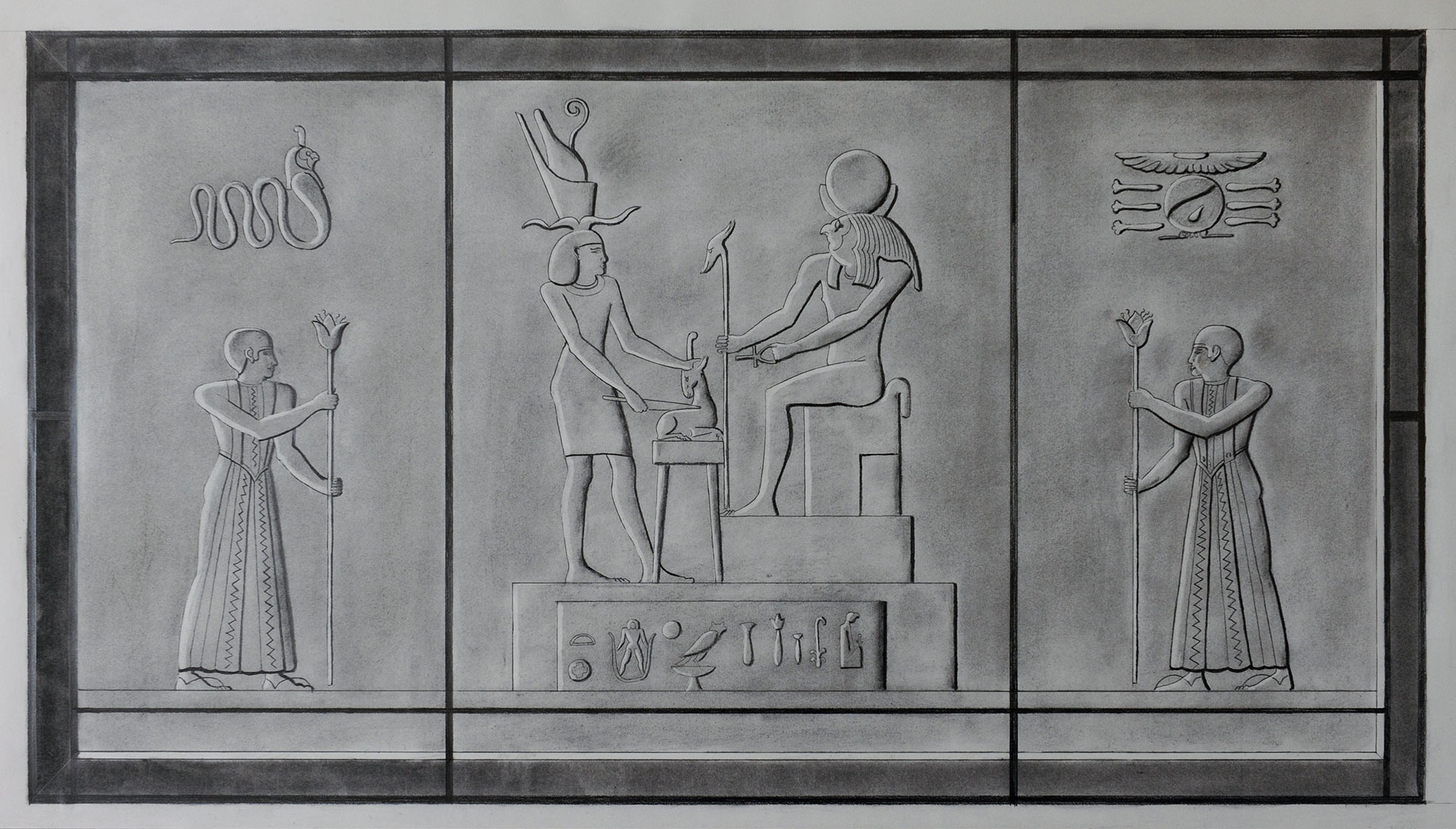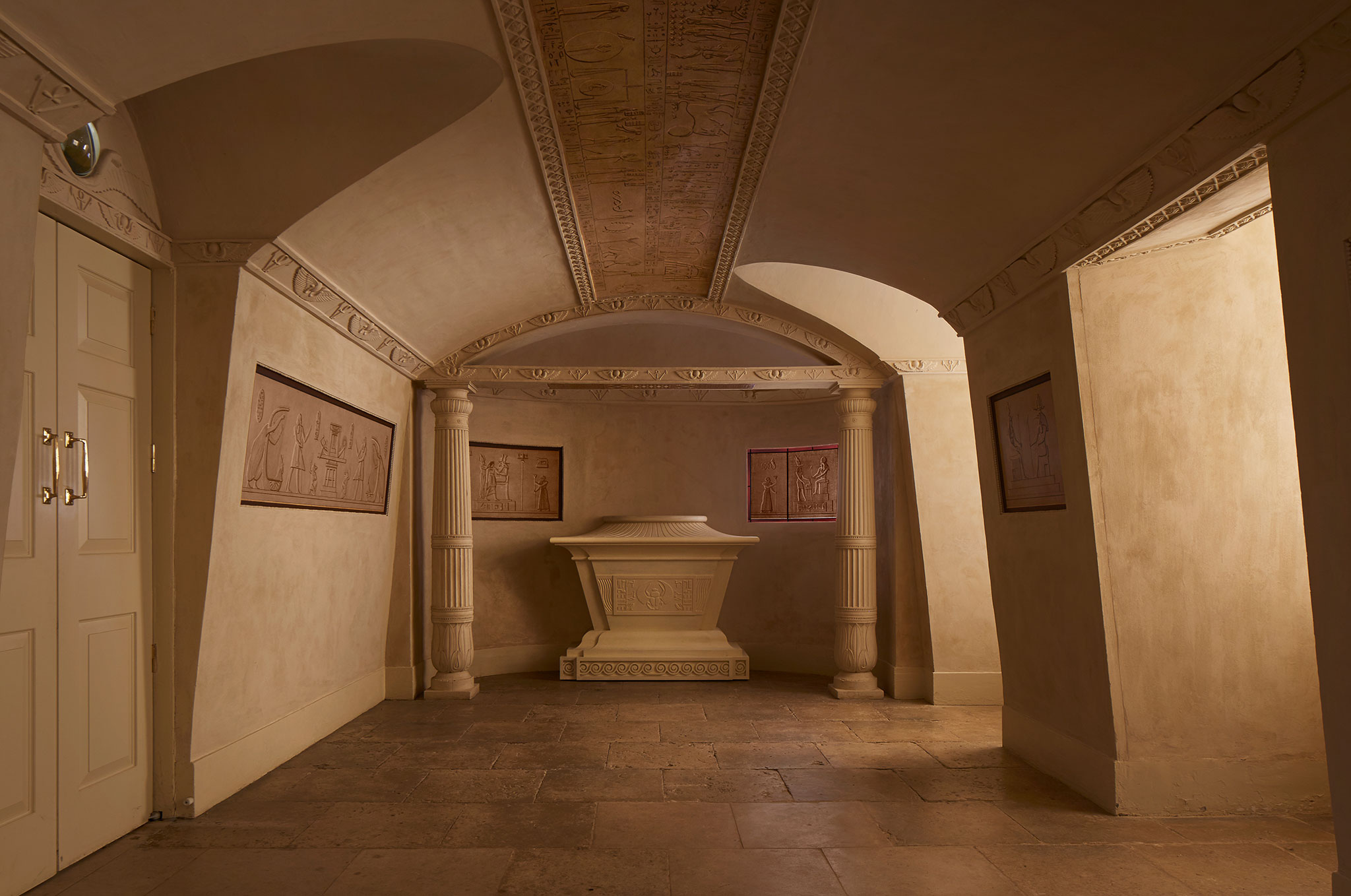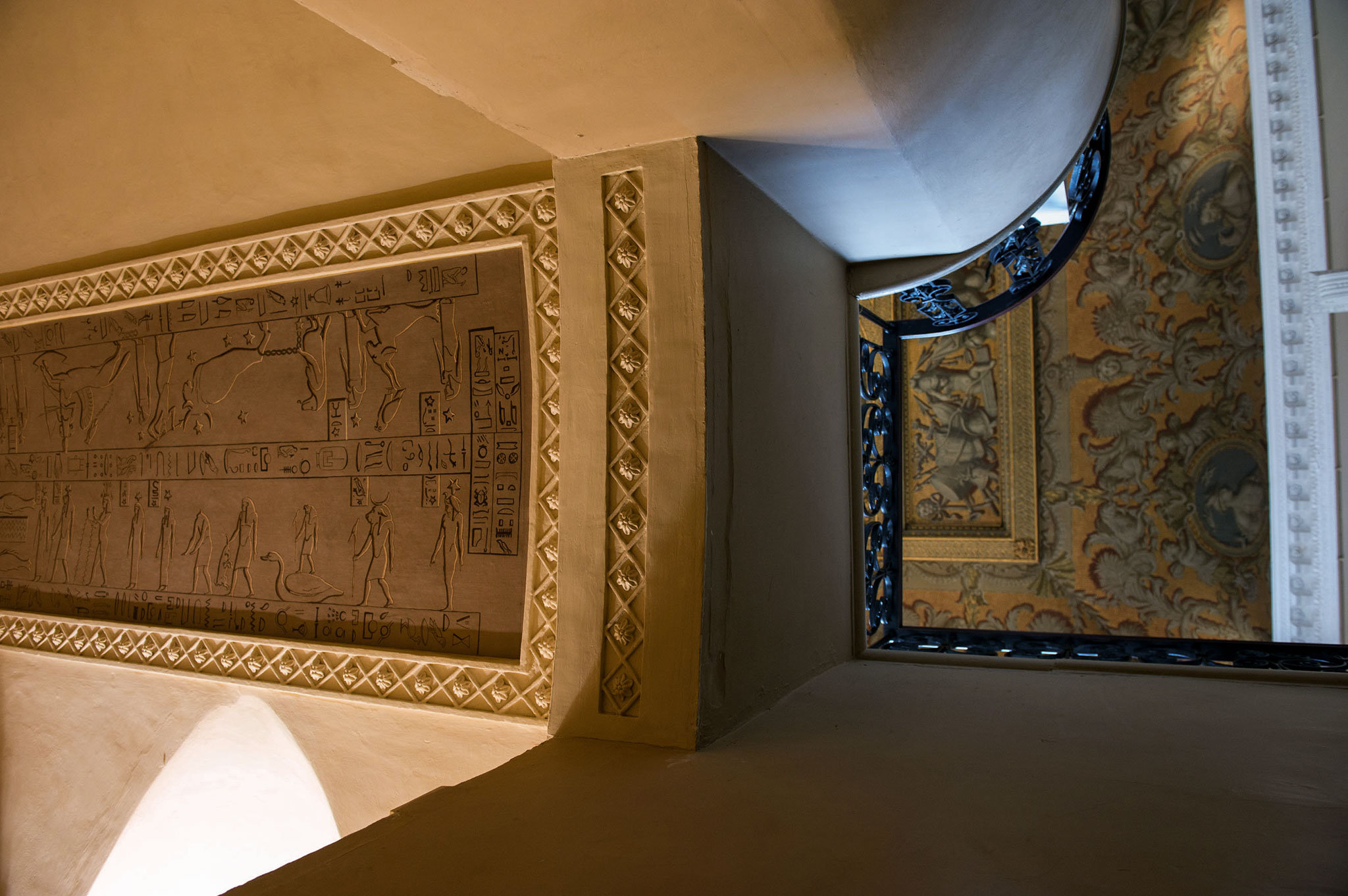 The Egyptian Hall at Stowe House was the first architectural project in England to register the impact of Baron Vivant Denon’s publication Voyages dans la Basse et la Haute Egypte (1802) which recorded in unprecedented detail and fidelity the ancient Egyptian antiquities that he visited when he accompanied Bonaparte’s military campaigns in the country. The room was formed in 1803 as the winter entrance to the house. It lies beneath the monumental North Hall (decorated in the eighteenth century by William Kent) and is reached by a curving, cobbled carriageway that dives beneath the steps of Vanburgh’s mighty portico. For his guests, the Ist Marquess of Buckingham, intended an experience akin to the discovery of an ancient tomb. Heat was provided by a sarcophagus/stove in the apse (reconstructed in wood by the architects, Purcell) while the battered walls and tunnel vault increase the sense of confinement. Crepuscular light admitted through the two windows from the carriageway is slightly augmented by an oil lamp magnified by a big lens set as a sun disc above the internal doors.