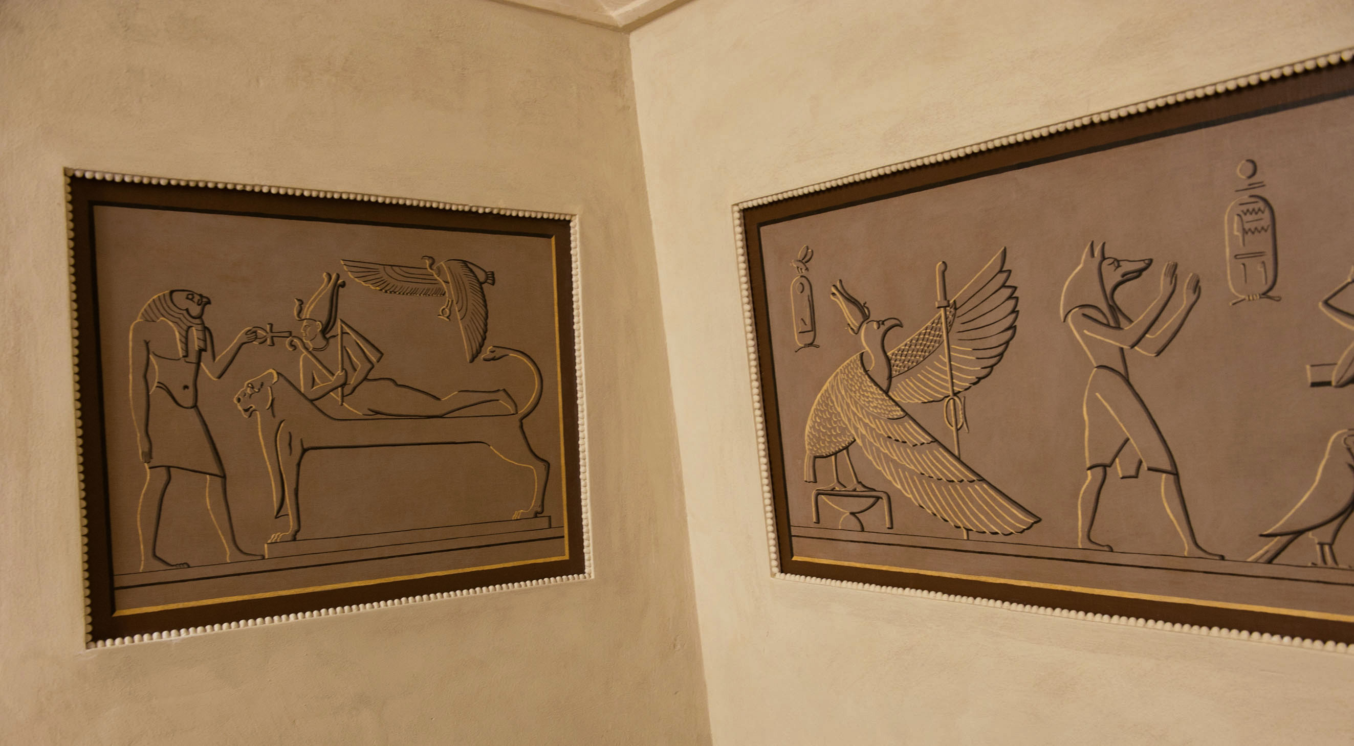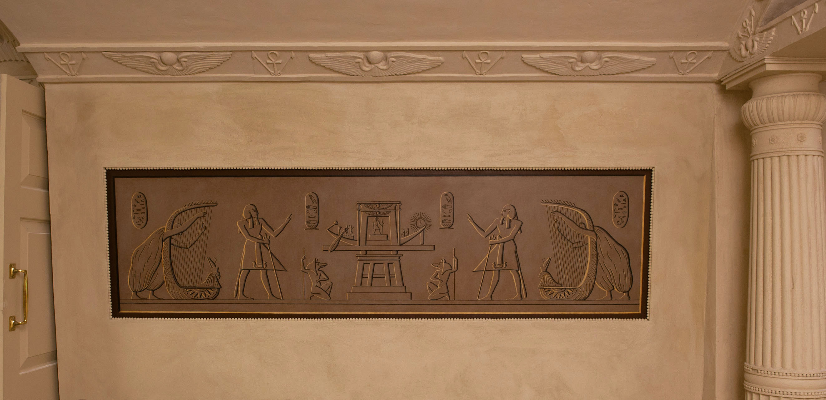 The paintings and stained glass which decorated the room were lost in the sale of 1921. So the project required a new version of the 1803 decoration devised by going back to the original source (the often minute engravings of Denon) and assembling imagery to fit the spaces. Two watercolours by Jean Claude Nattes and an early guidebook provided further guidance as did an initial research project on the sources by Hettie Dix of Purcell.