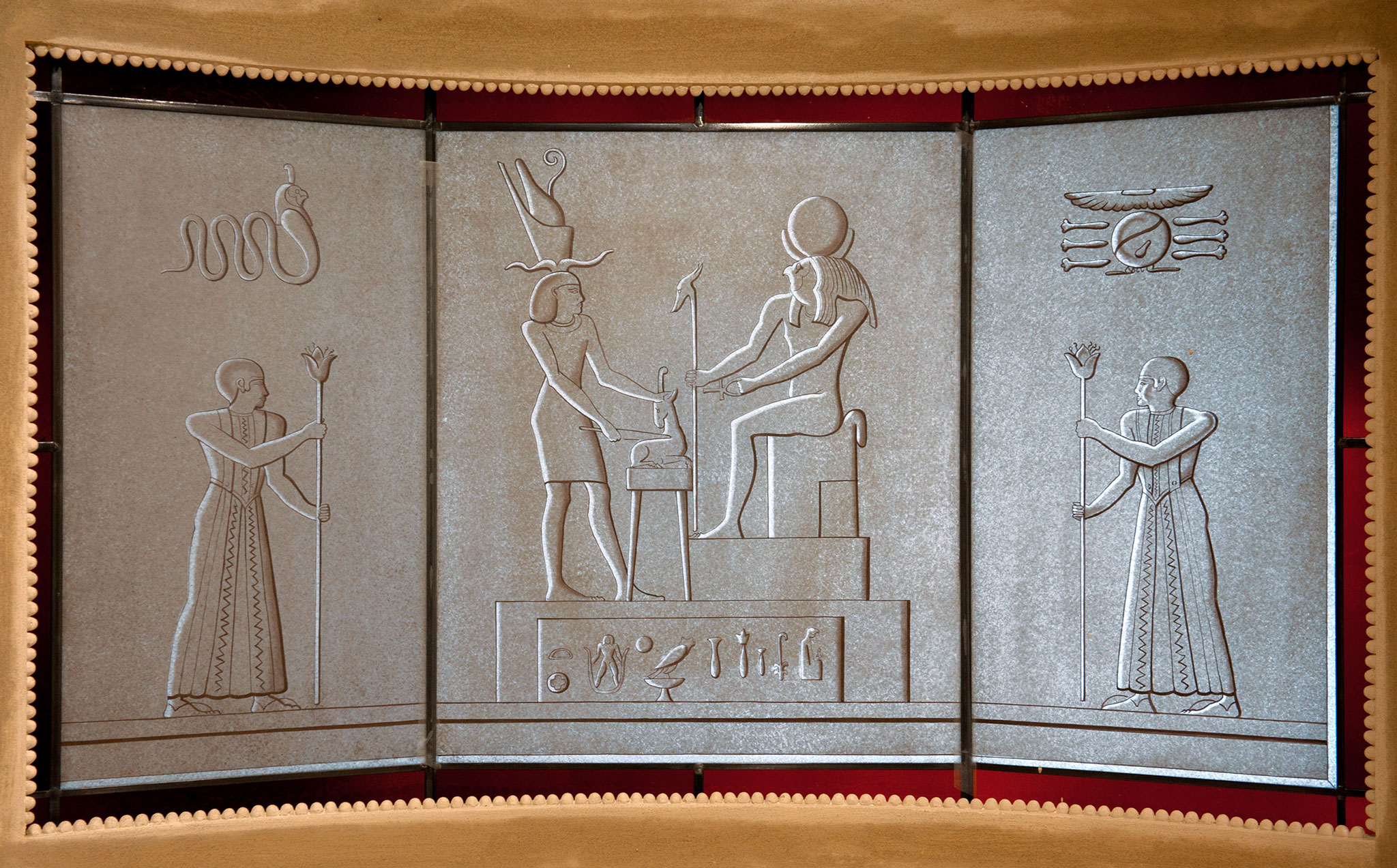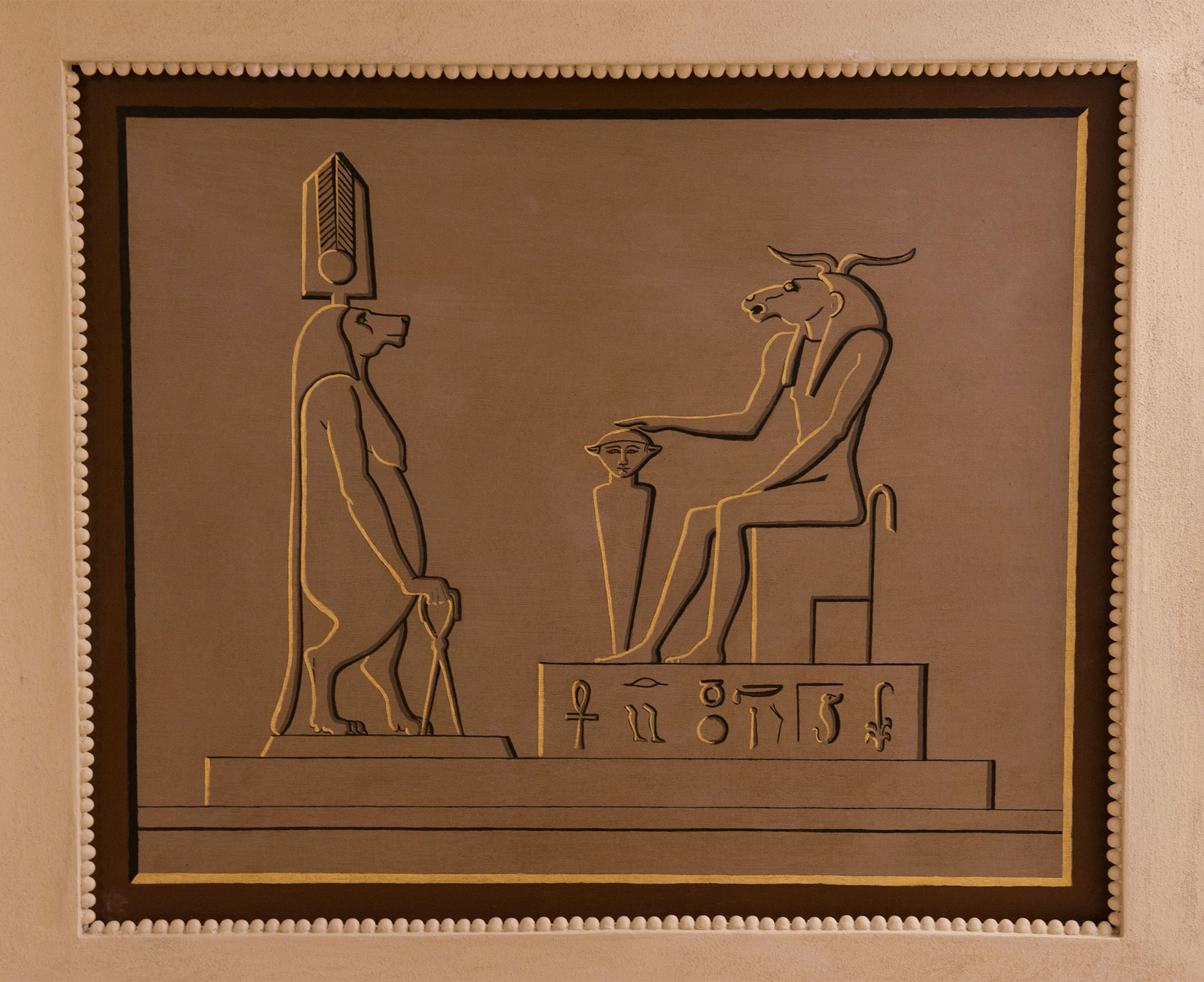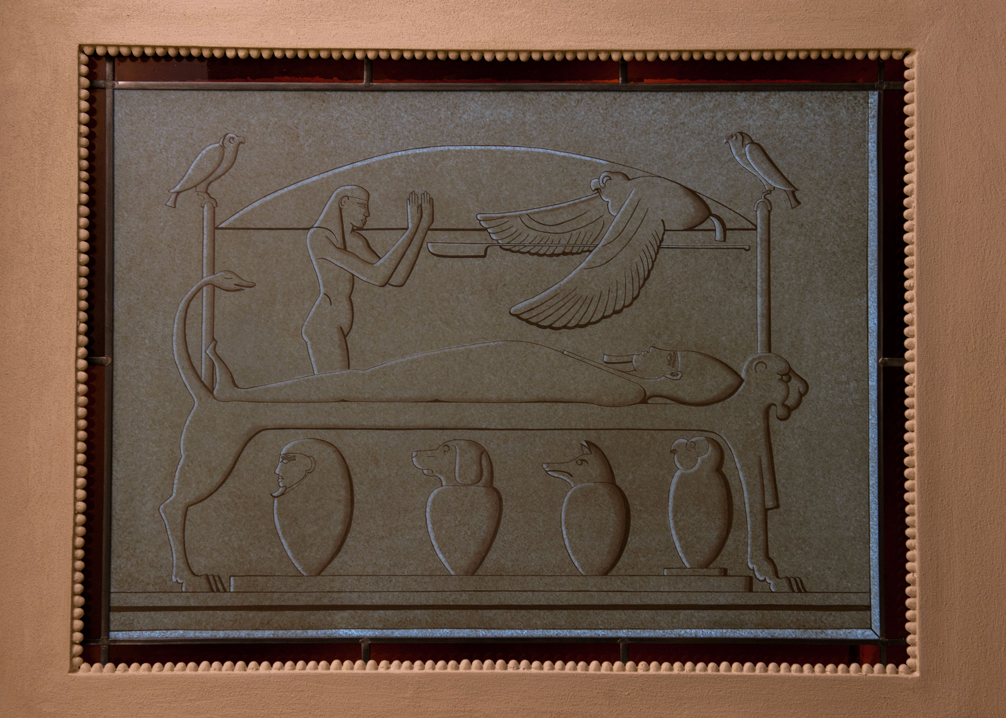 The wall panels were worked in the studio on canvas (supported by marine ply). The 20- foot ceiling canvas which represents part of a symbolic star chart in the hypostyle entrance hall of the temple of Hathor at Dendera (c.14-37 AD) was also executed in the studio and transferred on a drum for fixing ( by Richard Pelter of Fine Art Services) into its plaster frame. Cartoons, provided by the artist, for the stained glass panels (lit originally by borrowed light from adjacent rooms) were copied by Dan Humphries of Holy Well Glass with great accuracy and skill. The beaded plaster framing of the panels and the painting of the walls is the work of Fairhurst Ward Abbots.