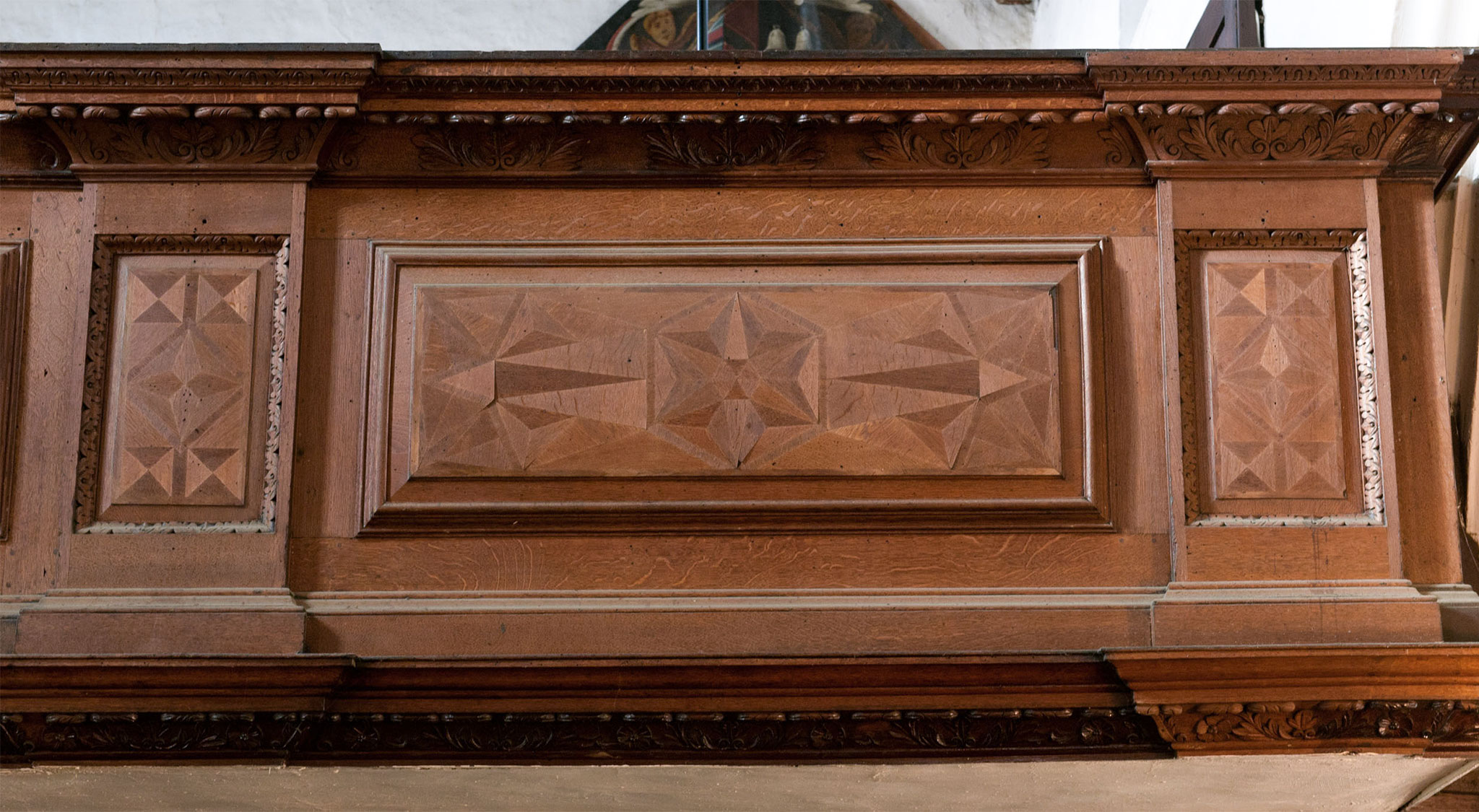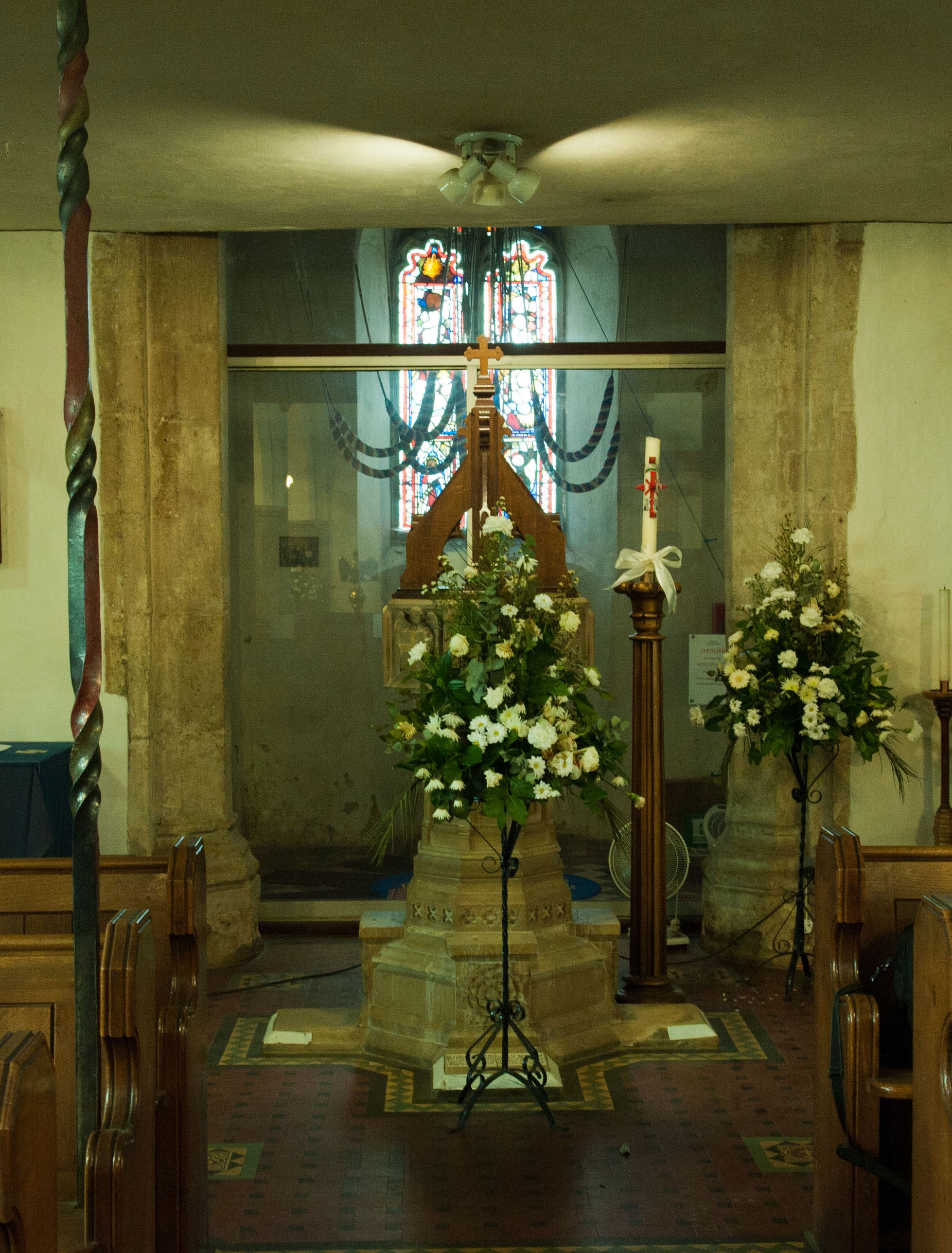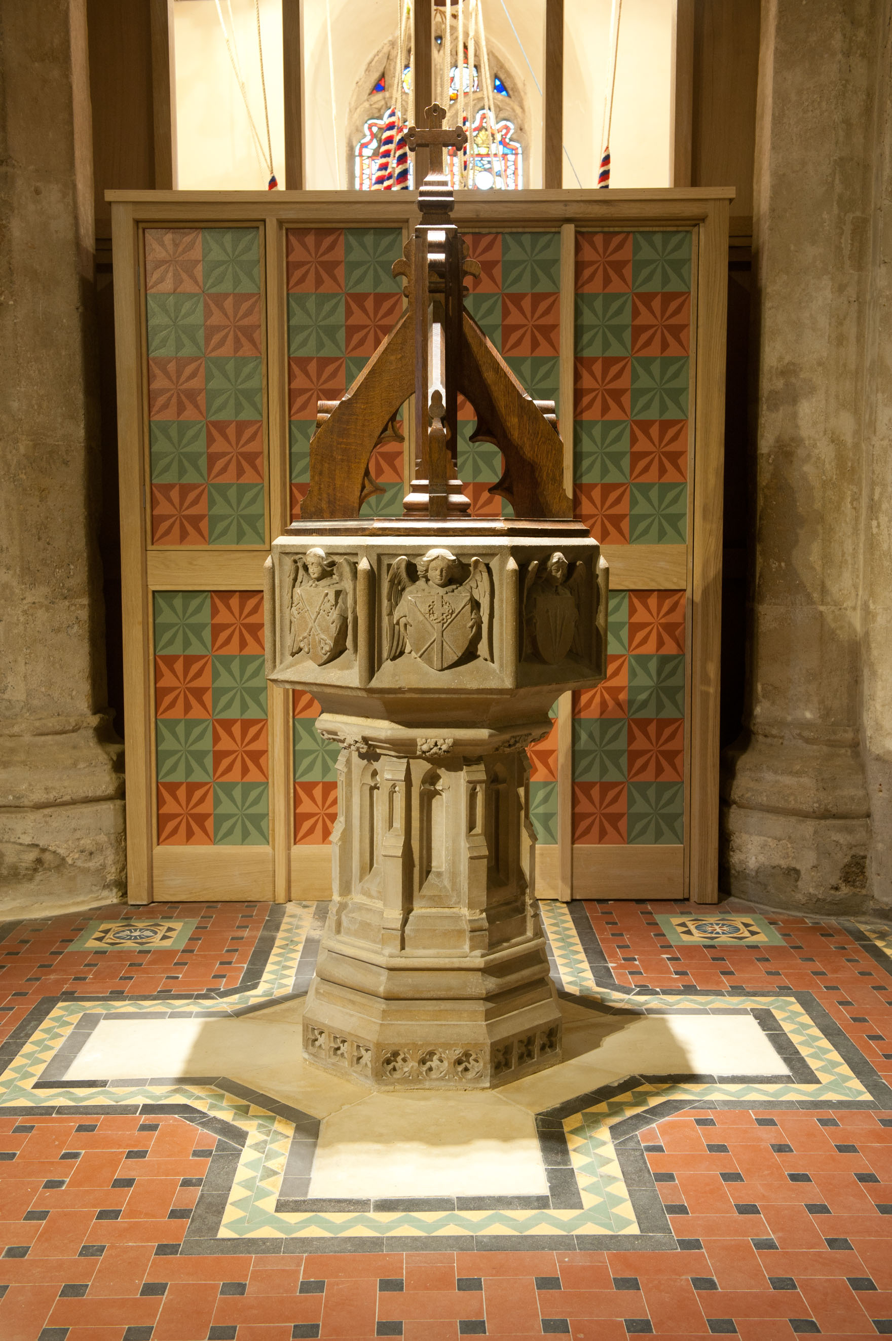The inspiration for the panels came from the marquetry decoration on the front of the Georgian west gallery at Downham. But the colours and the indication of relief (derived from an unfolded origami dove) suggests medieval diaper work – a suitable background for the Victorian Gothic font.