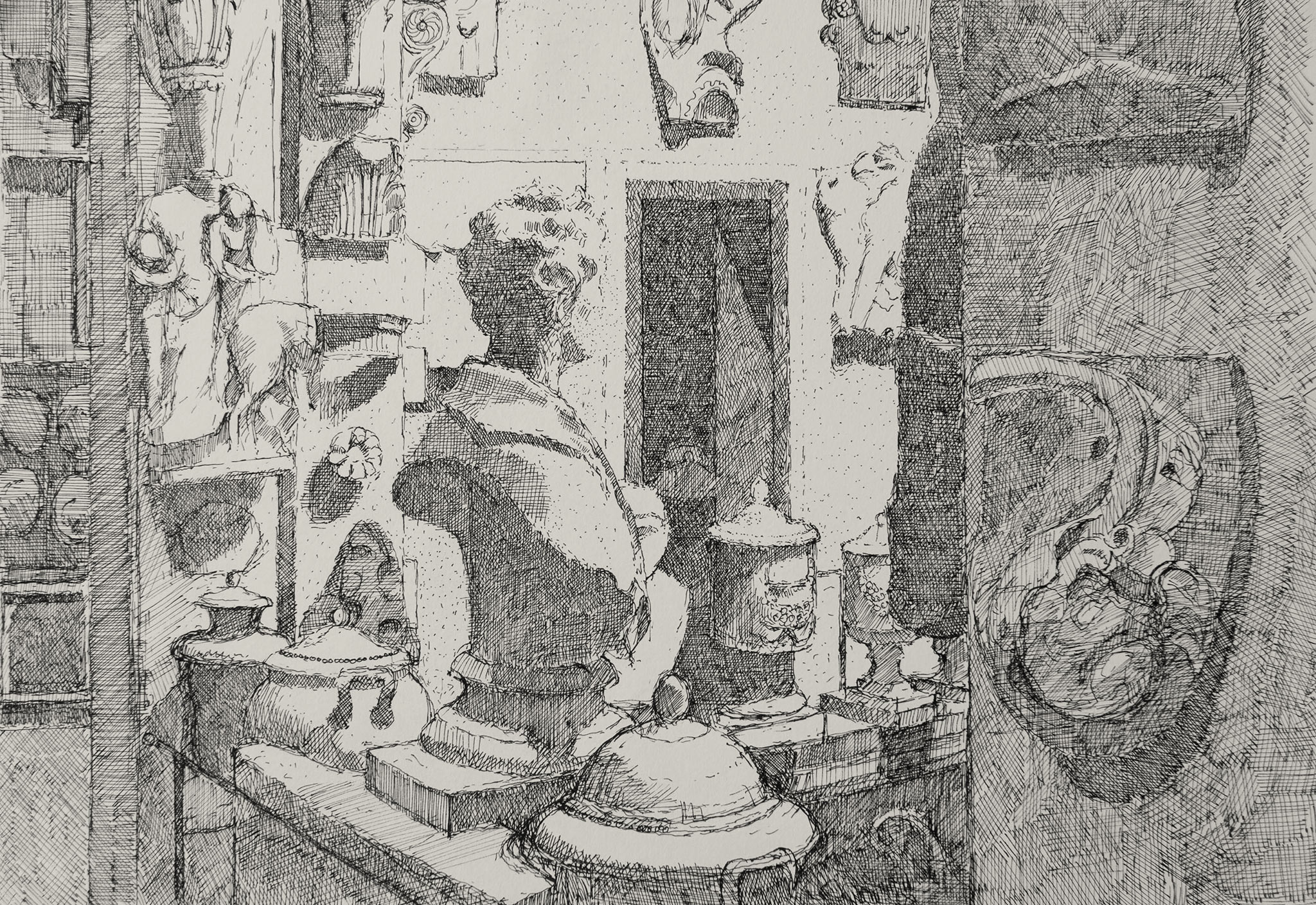Lion monopod beneath Soane bust pen, ink and wash 16.5 x 11.5