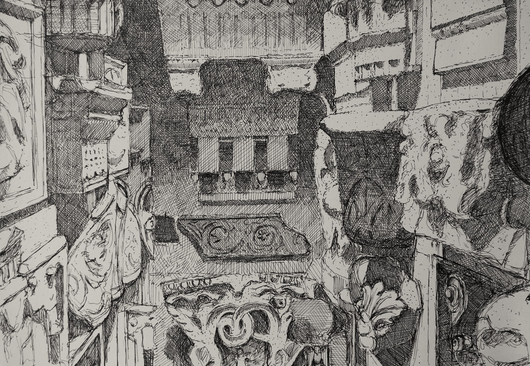 Museum Corridor from the Colonnade pen and ink 15 x 9