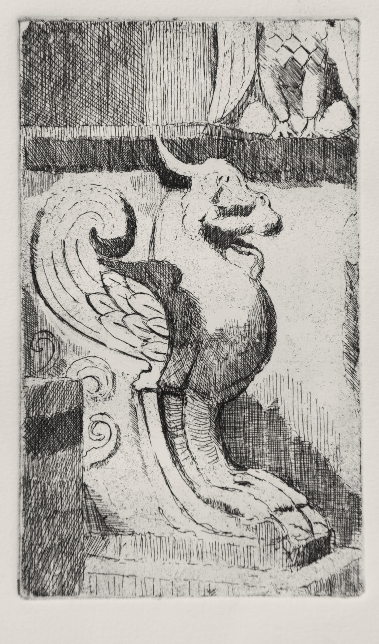 Griffin monopod in the Museum Corridor etching 7.5 x 4.5
