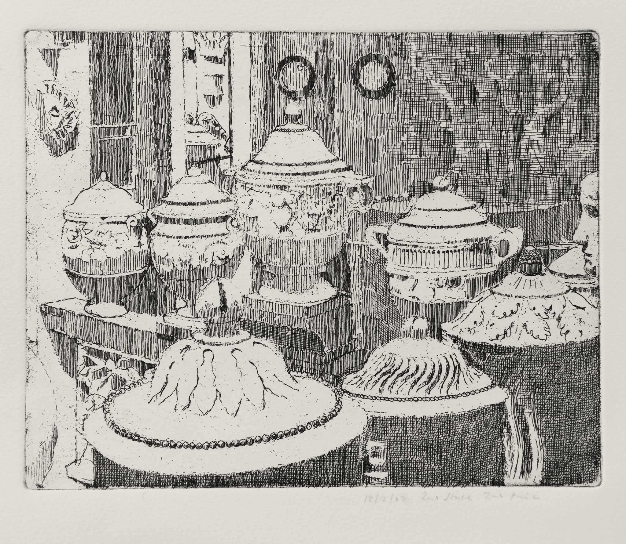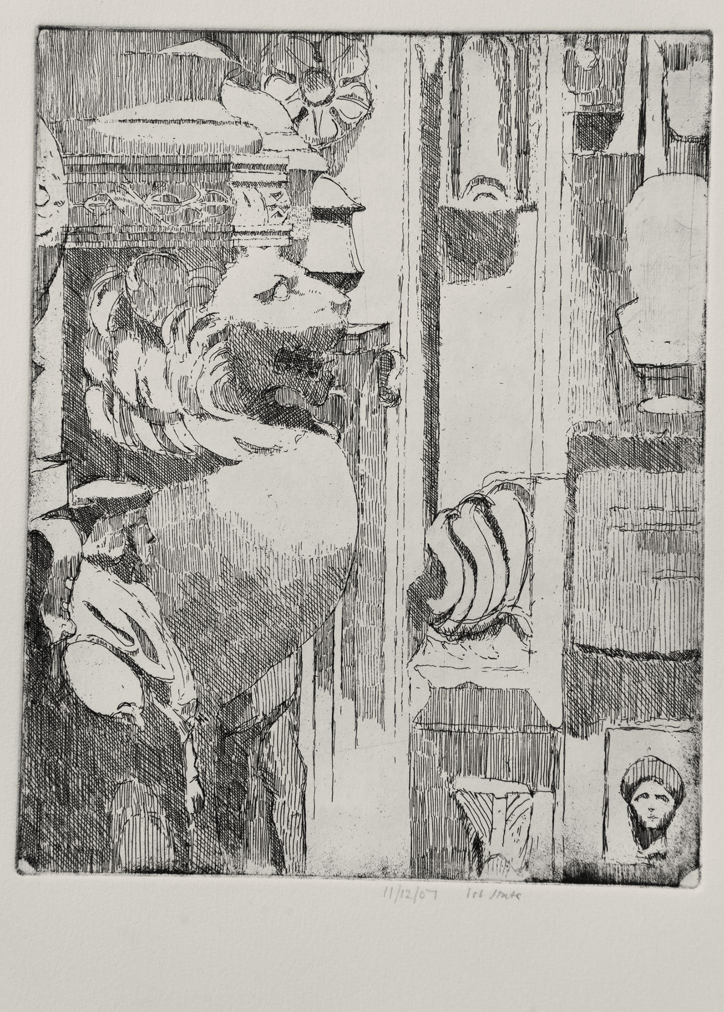 In 2007 I was very kindly allowed by the then Director, Tim Knox, to draw in Sir John Soane’s Museum on Mondays when it is closed to the public. The drawings shown here represent most of the work that I did at the museum. All the work was done on site including the etchings which represent their subjects in reverse, appropriately for an interior where so much is seen in mirrors. It was a privilege to work in these remarkable spaces.