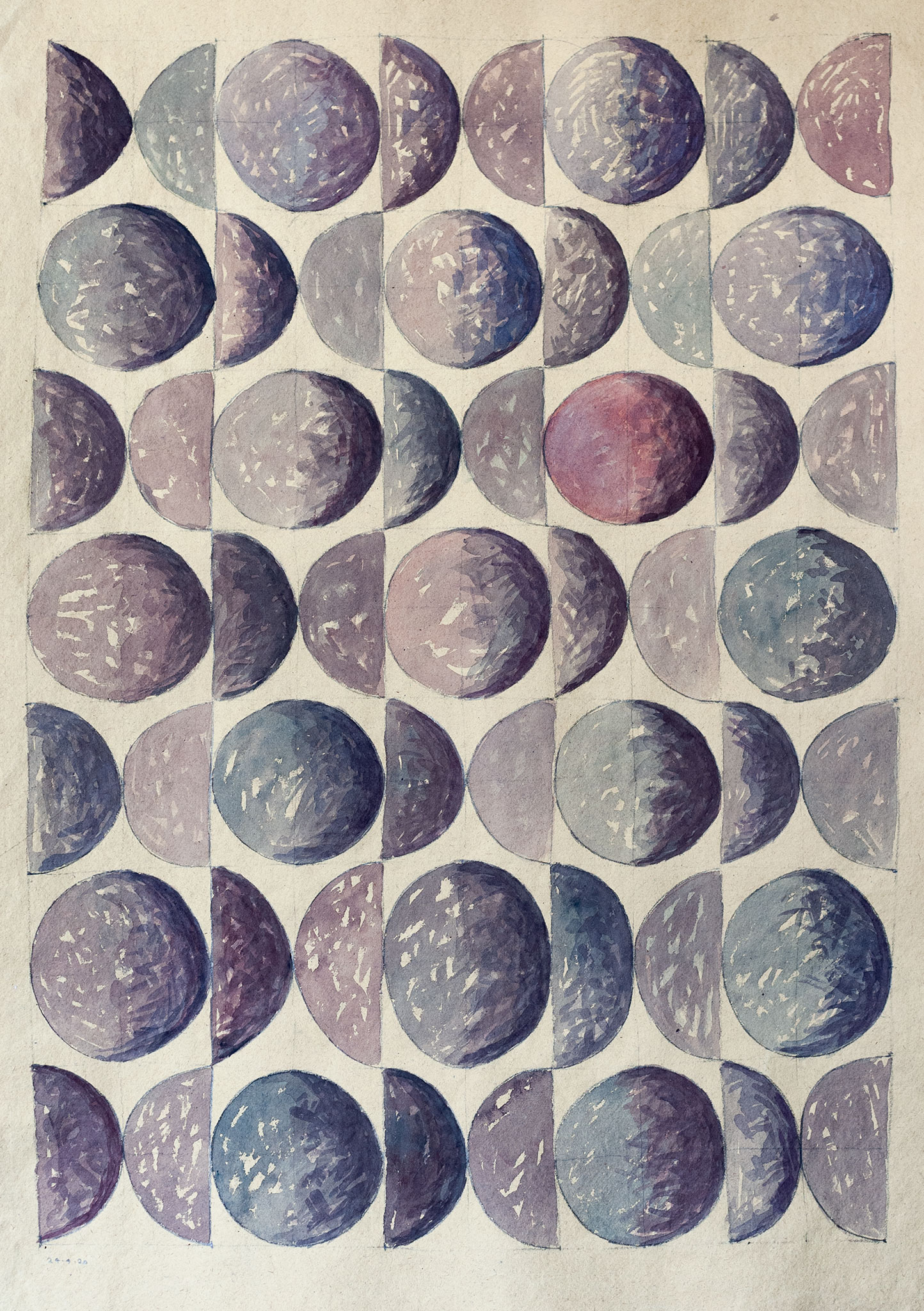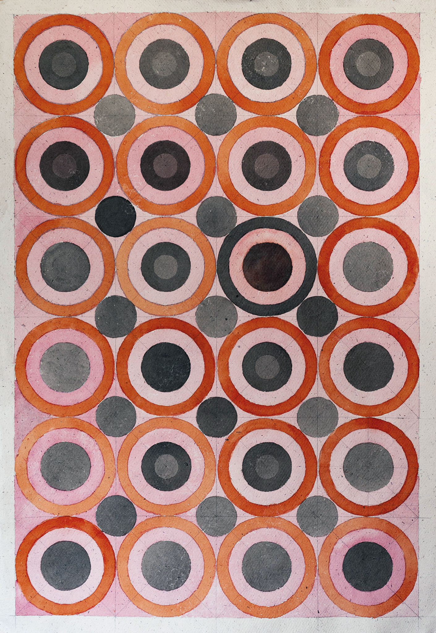 Circles and disks in red, grey and black graphite and watercolour 28 x 20