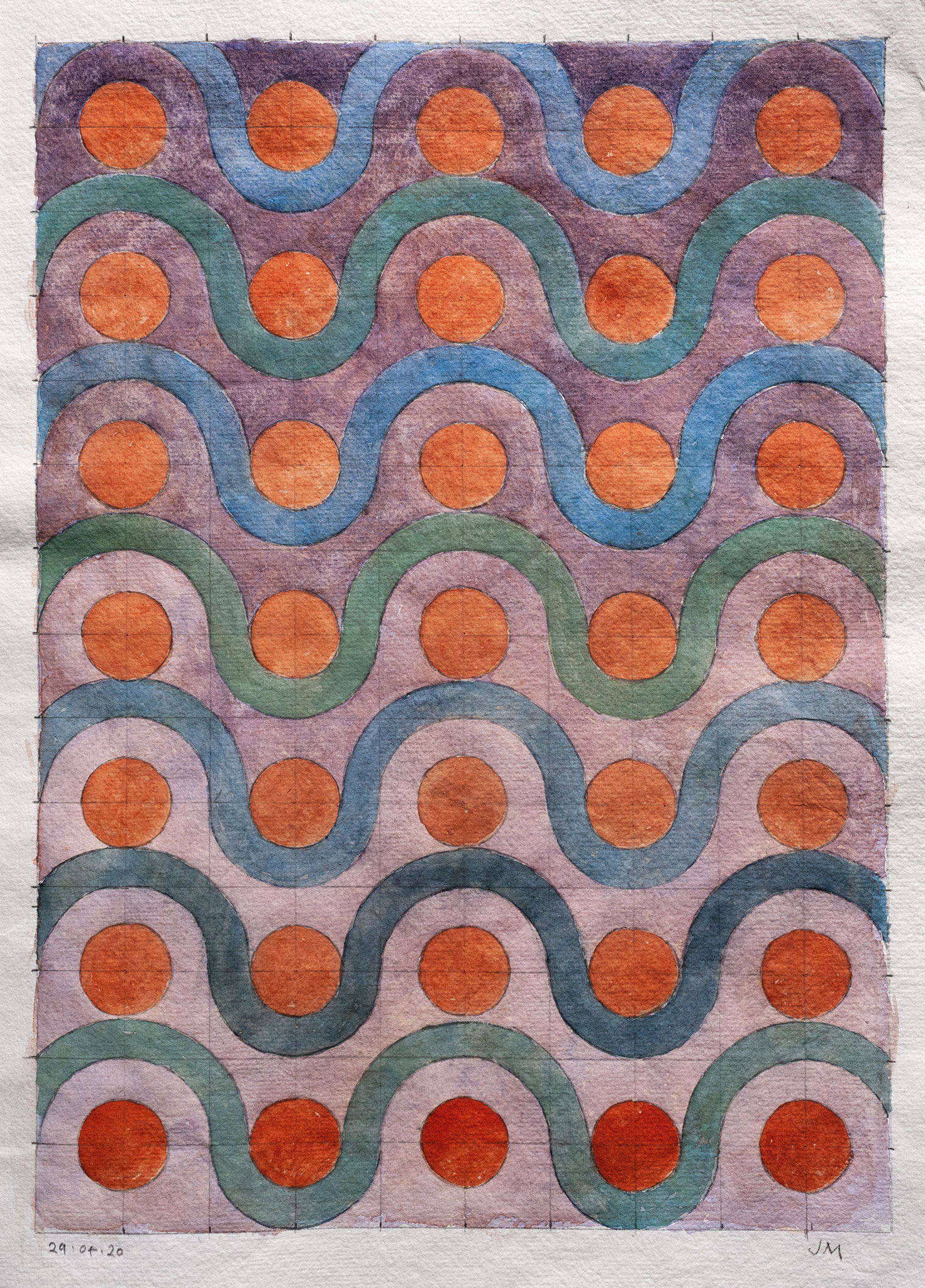 Orange disks and meandering blue/green graphite and watercolour 14 x 10