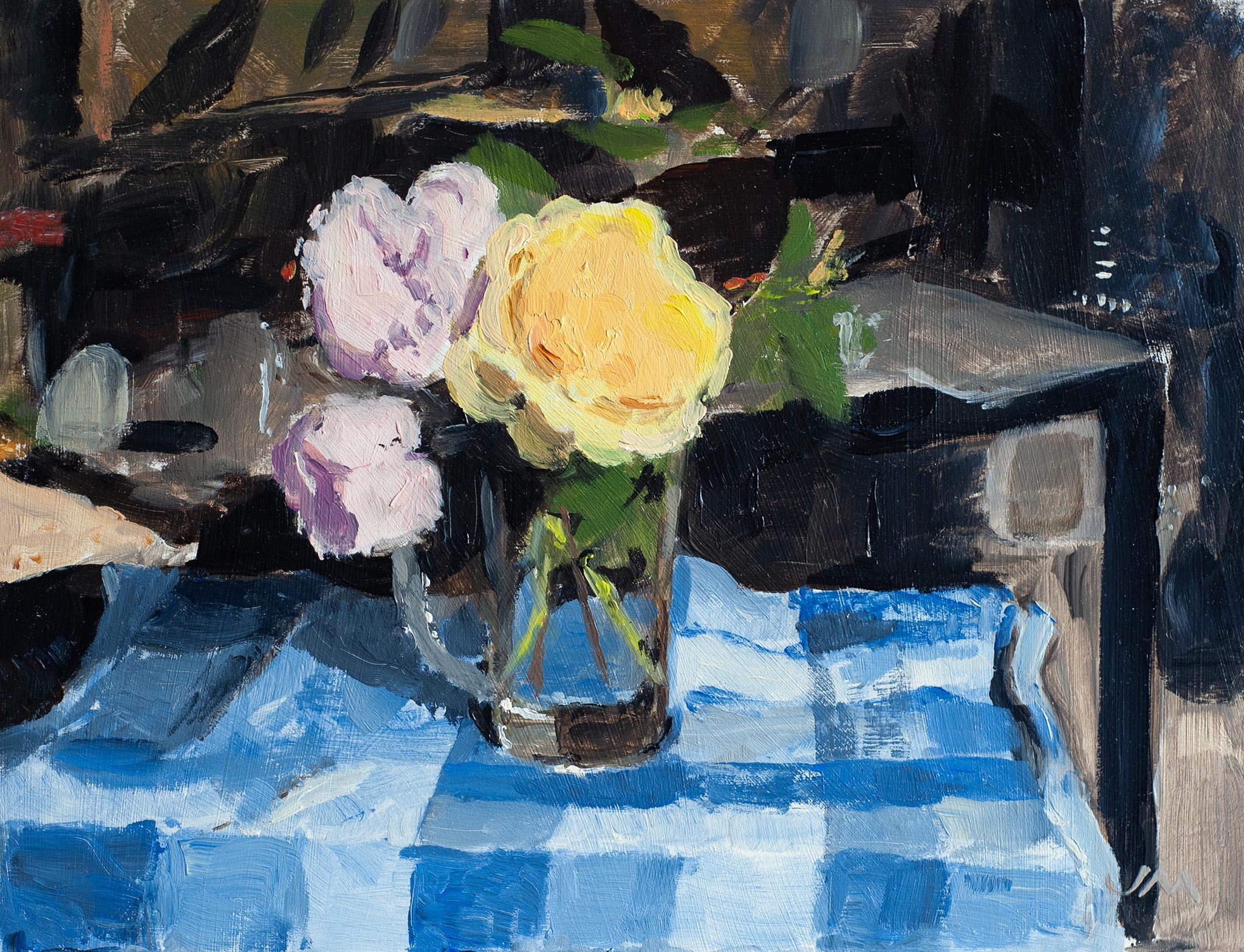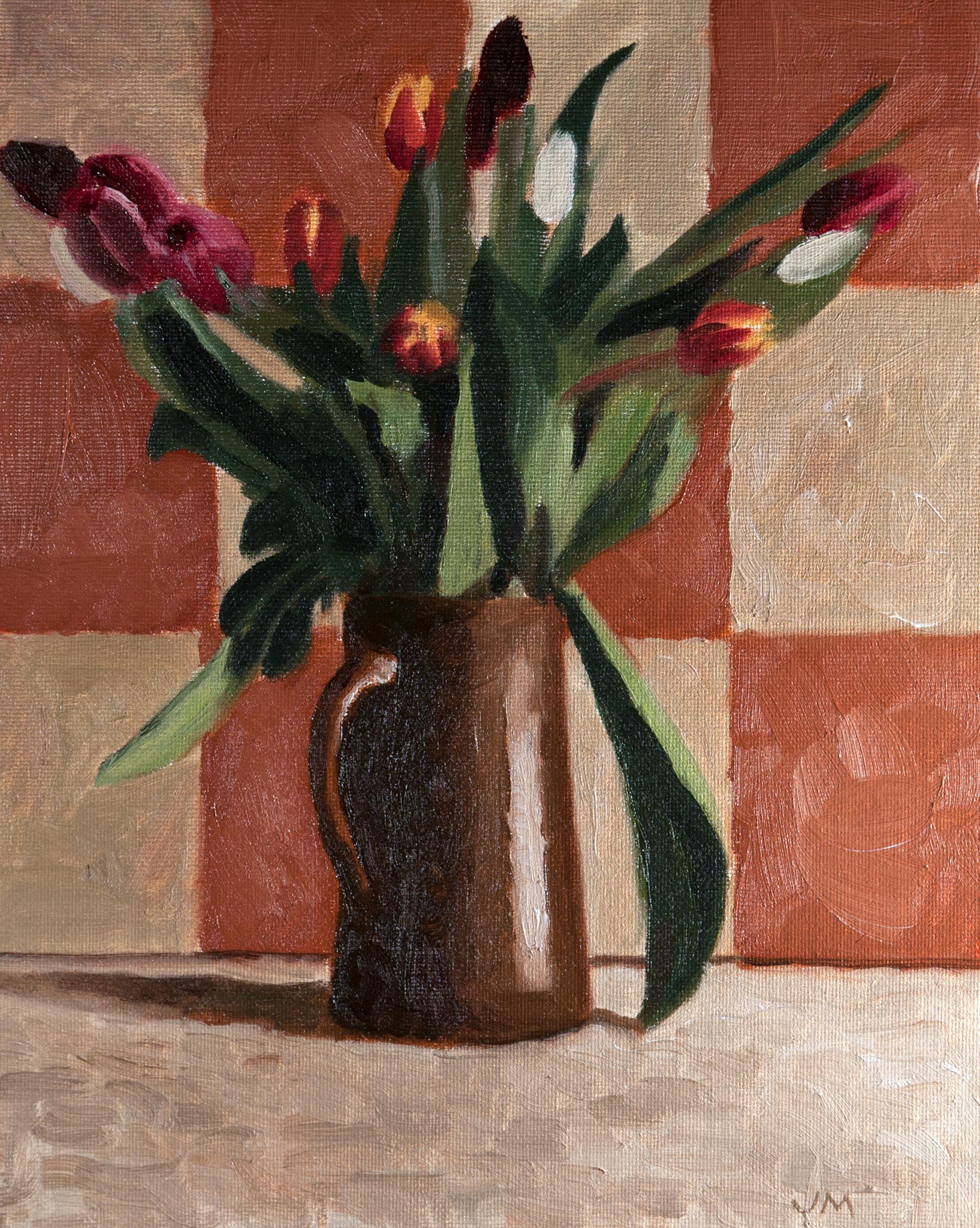 Tulips against checks (2013) oil on canvas board 12 x 10