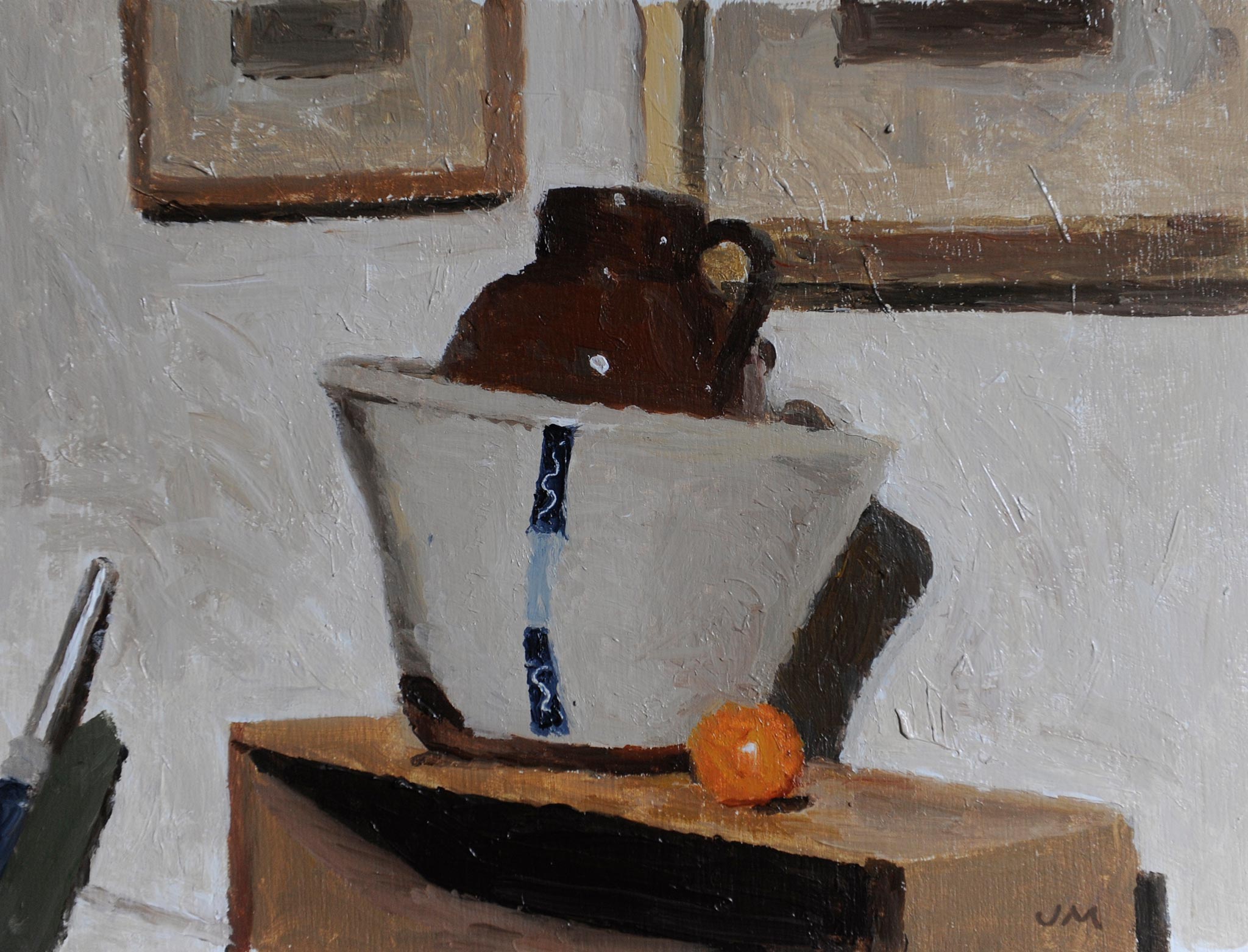 Wobbly bowl, jug and orange (2015) oil on panel 8 x 10